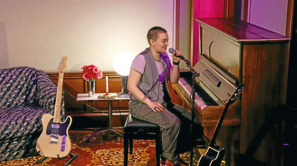 Die feinen Klavierakkorde von Tonis balladesken Songminiaturen füllen den Raum zwischen den hohen Decken des neogotischen Billardsalons im Kurhaus Göggingen und den Köpfen des Publikums, das den Ort bis auf den letzten Zentimeter füllt. Manche haben die Augen geschlossen, viele lächeln. Als die junge Singer/Songwriterin an die akustische Gitarre wechselt, wirken ihre Stücke noch einen Hauch zarter und offenbaren einen kurzen, aber tiefen Blick in ihre innersten Gedanken zu Menschen, die man auf die unterschiedlichsten Weisen liebt. Toni beginnt ihr Set mit dem Song „Meet some people“, und er könnte nicht passender gewählt sein, ist es doch die Intention des neuen Formats „Sound of Schwaben“, jungen Künstlerinnen und Künstlern aus Stadt und Bezirk „Sichtbarkeit vor einem ganz neuen Publikum zu verschaffen. Die Bühne ist eben das Schaufenster der Musik“, wie Kulturreferent Jürgen Enninger zur Begrüßung die Idee hinter der Konzertreihe beschreibt, die sich Maria Trump und Max Schlichter, Popkulturbeauftragte der Stadt, beziehungsweise des Bezirks, ausgedacht haben. Den beiden schwebten Konzerte in Wohnzimmeratmosphäre vor, und dass der Plan schon beim ersten Konzert aufging, liegt nicht nur an den Blumenvasen auf den Verstärkerboxen und dem recht spontan bei Kleinanzeigen erstandenen Sofa für die Bühne.