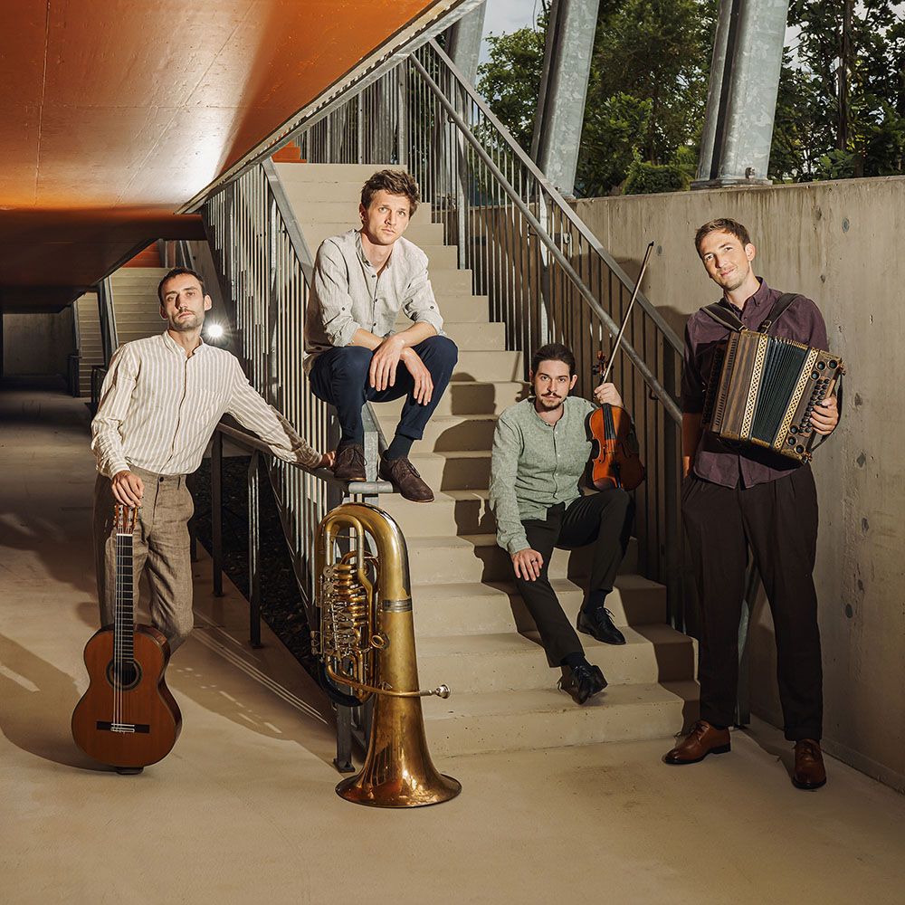 Das Leichte ist am schwersten – Geige, Steirische Harmonika, Gitarre und Tuba – vier virtuose Musiker weben ein dynamisches, kammermusikalisches Geflecht, das in einer Eleganz und Leichtigkeit aufblüht, die man im Zusammenhang mit Volksmusik so nicht erwartet hätte.