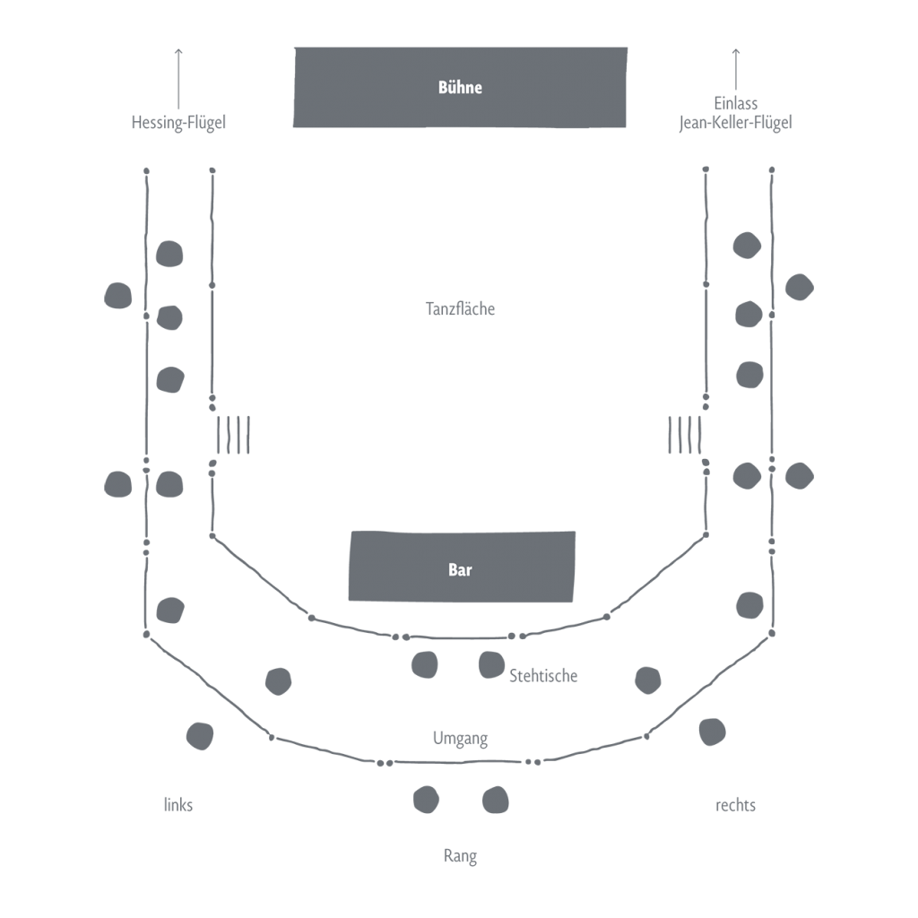 Im Party-Ambiente ist der Theatersaal unbestuhlt, so dass viel Platz zum Tanzen und für spontane Begegnungen vorhanden ist.In den Seitenflügeln stehen je nach Veranstaltung Sitzplätze zur Verfügung.